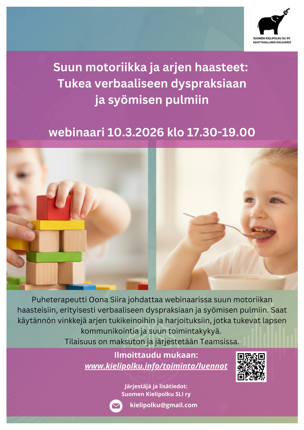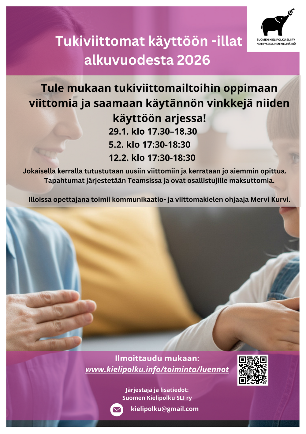 Kehityksellinen kielihäiriö (ts. kielellinen erityisvaikeus, SLI tai dysfasia) ilmenee lapsen puheen ja kielen kehityksen viivästymisenä tai poikkeavana etenemisenä. Kielihäiriö paitsi haastaa, myös rikastuttaa arkea ja opettaa paljon uutta. Me olemme täällä sinua varten – älä jää yksin, tule mukaan!