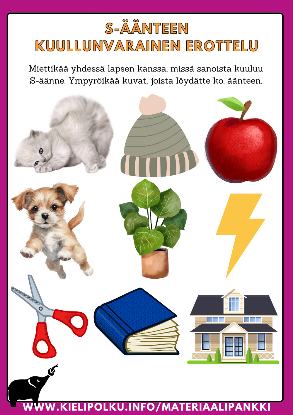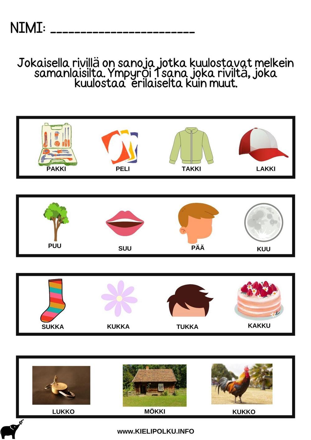 Tässä harjoituksessa aikuinen lukee lapselle sanat, lapsi kuuntelee ja ympyröi sanan, joka kuulostaa erilaiselta. Samalla voi harjoitella sanomaan sanoja. Aikuinen voi myös kuvailla joka sanan, ja lapsi arvaa mistä sanasta on kyse, joko näyttämällä sanan, tai sanomalla sen nimen. Sanoja voi myös tarkastella niin, että mietitään lapsen kanssa, mikä sanoissa on erilaista. Esim. Puu, Suu, Kuu.