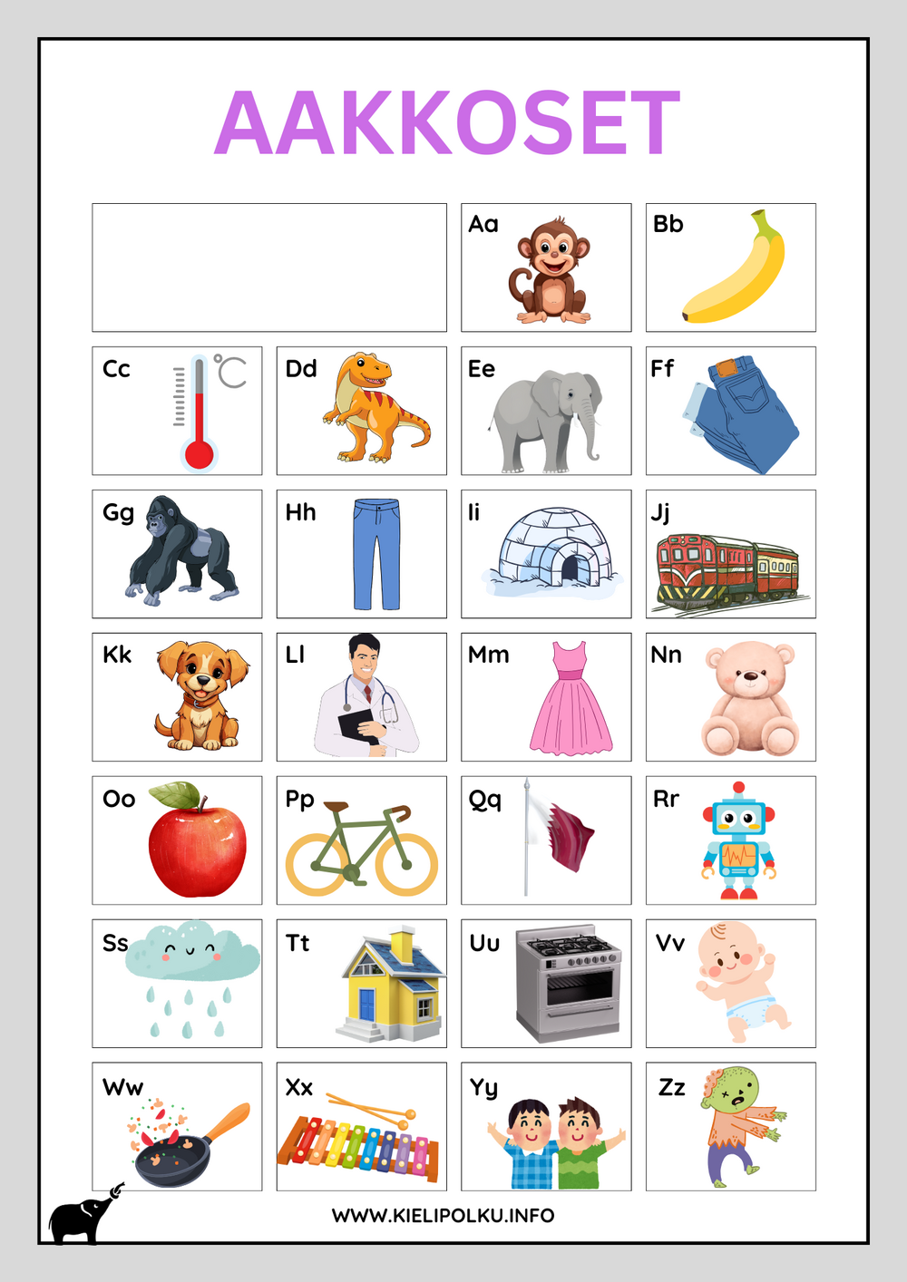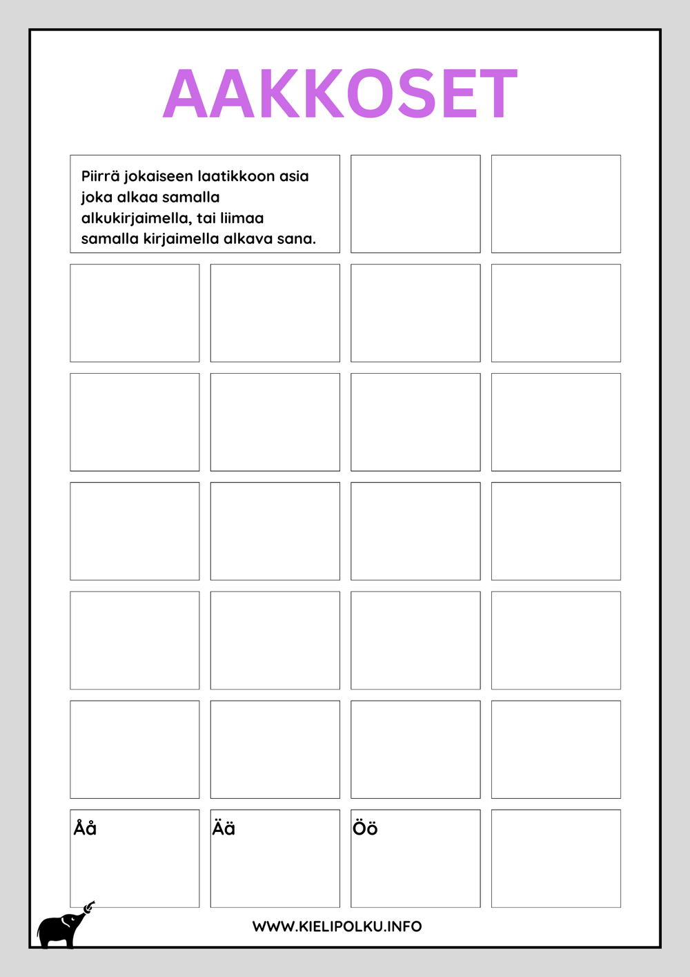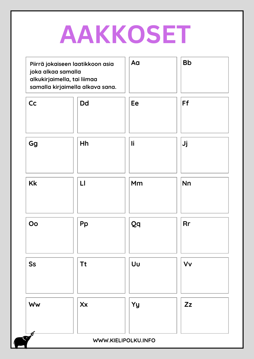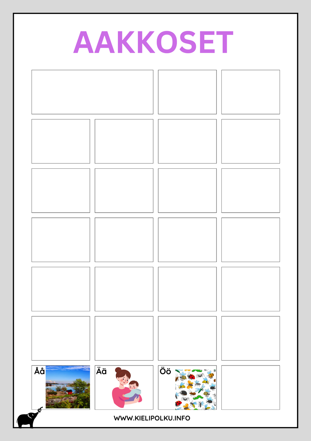 Aakkoset A-Ö. Leikkaa kuvat, ja liimaa ne paikalleen. Tälle dokumentille on monta käyttöä. Nämä voi tulostaa ja käydä läpi lapsen kanssa isot ja pienet kirjaimet. Esikoulun aikana opitaan monesti vain pelkät isot kirjaimet, ja pienet kirjaimet tulevat sitten vasta koulussa tutuiksi. Tähän voi myös tulostaa tyhjän dokumentin ja harjoitella sanoja, ja sitten liimata kuva oikean kirjaimen kohdalle.