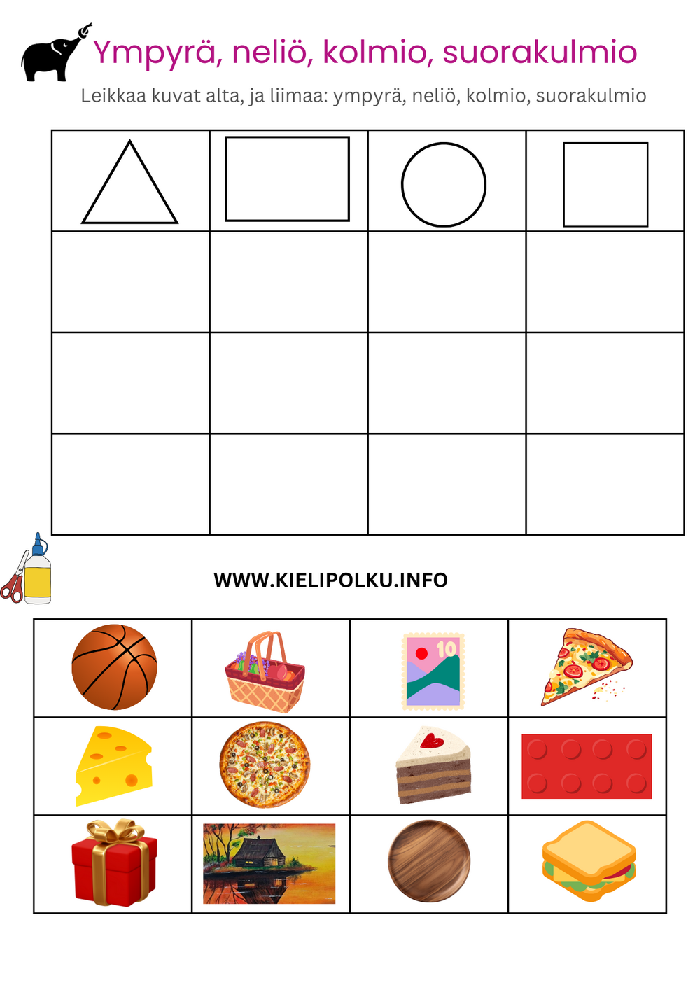 Tässä tehtävässä lapsi voi harjoitella geometrisiä muotoja ja samalla kehittää hienomotorisia taitoja ja työstää käden ja silmän koordinaatiota. Tässä tehtävässä voi leikata saksilla, ja liimata esineitä, jotka ovat: ympyrän, neliön, kolmion ja suorakulmion muotoisia.