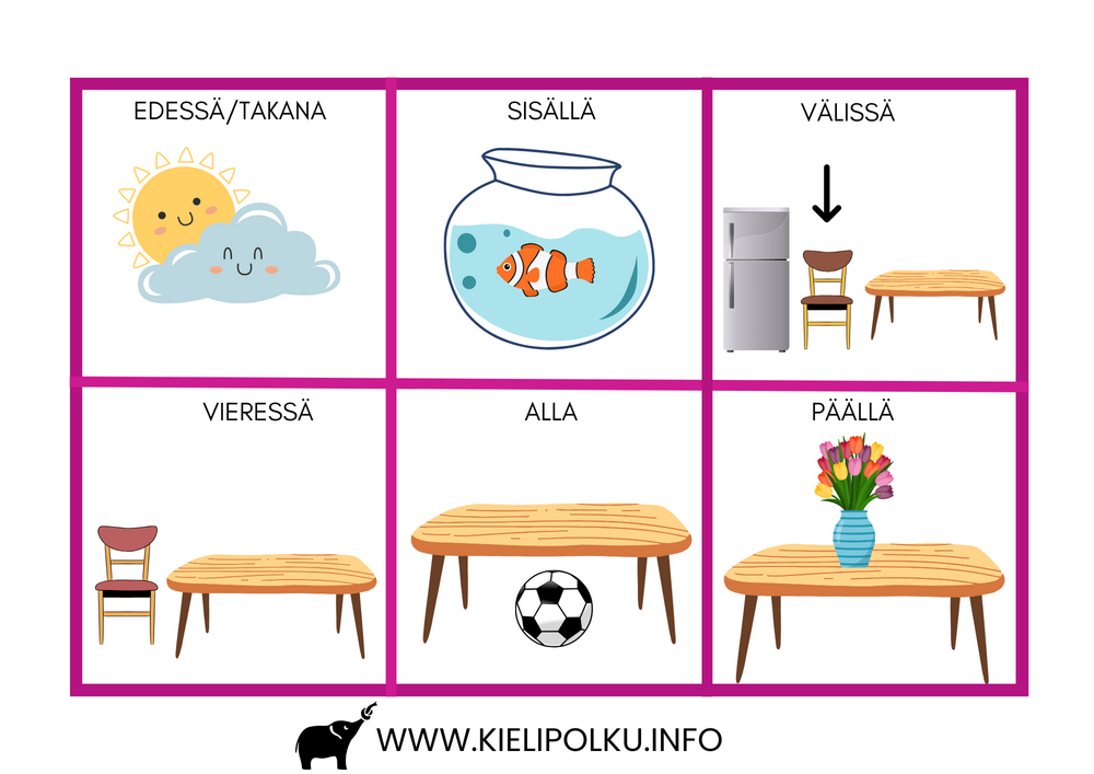 Prepositiot auttavat lasta hahmottamaan, missä esineet ja ihmiset sijaitsevat suhteessa toisiinsa, ja itseensä. Harjoitellessaan prepositioiden käyttöä, lapsi oppii ymmärtämään ja käyttämään kielellisiä rakenteita, jotka kuvaavat näitä tilasuhteita. Tämä on tärkeää kielellisen ymmärryksen kehittymiselle.