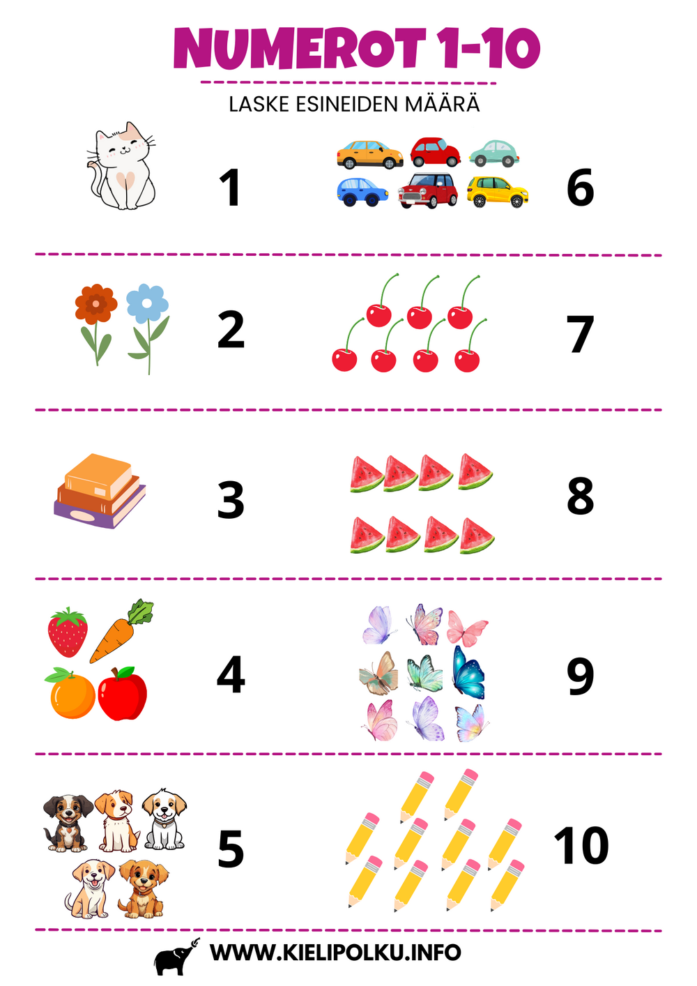 Tässä tehtävässä harjoitellaan numeroita. Voi harjoitella myös värejä.