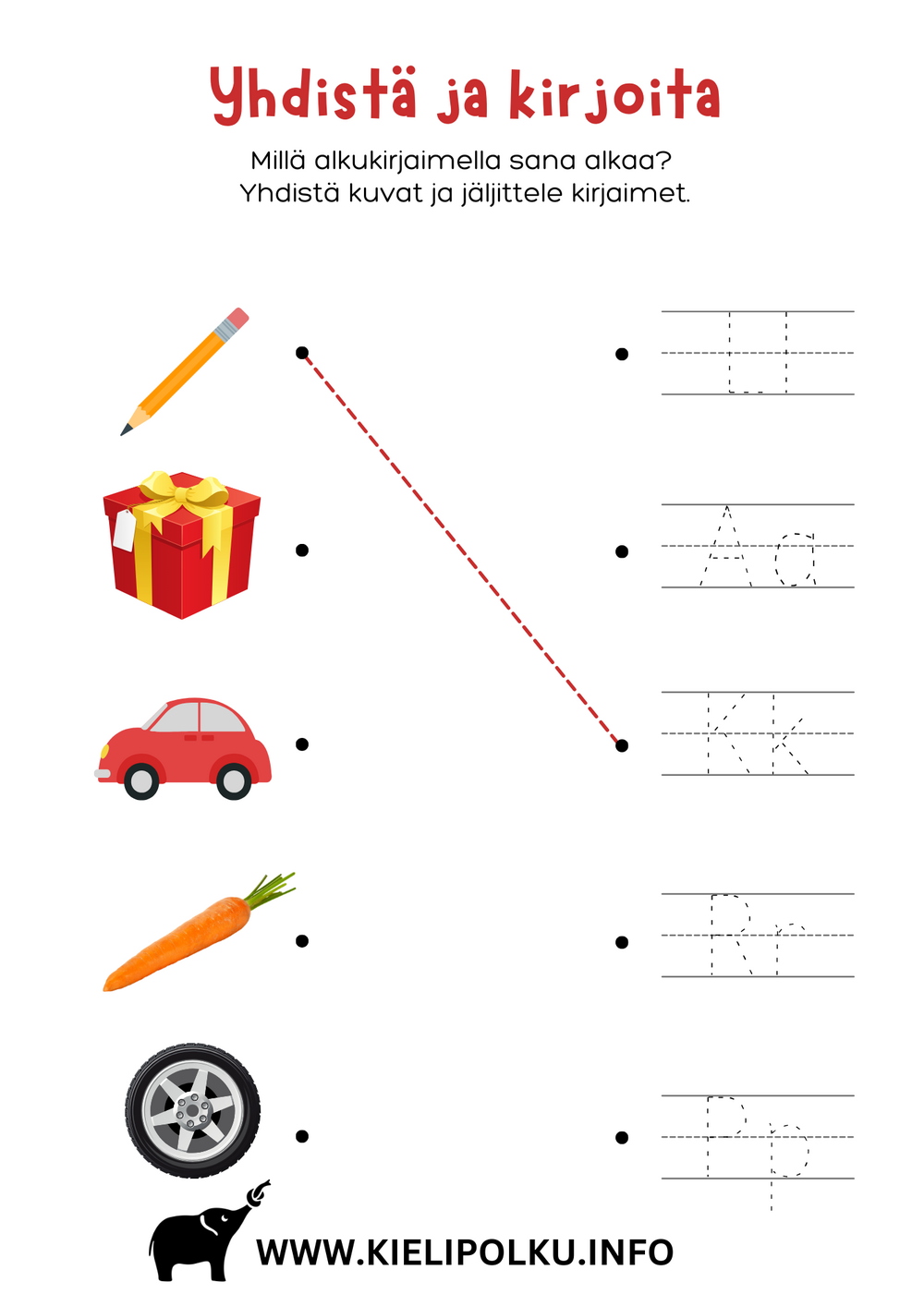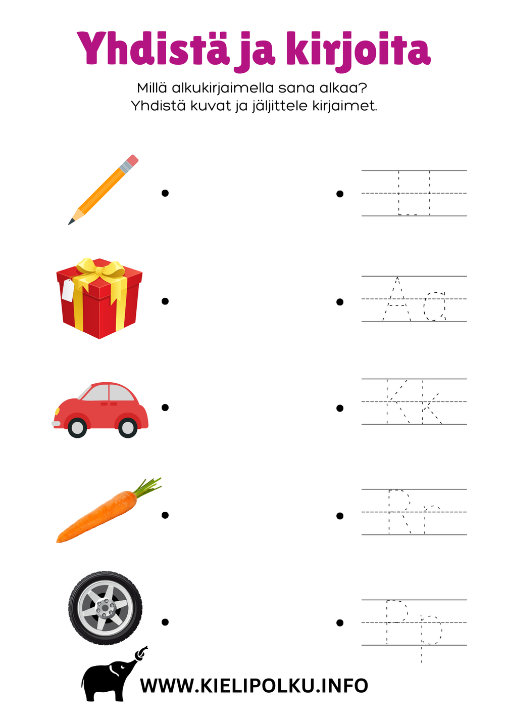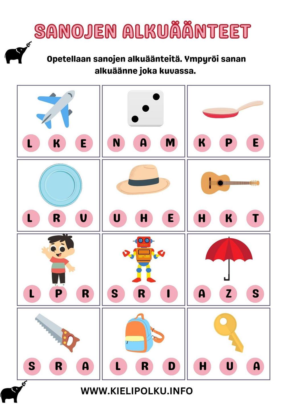 Tämän tehtävän kautta voi harjoitella lapsen kanssa sanojen alkuäänteitä. Tutkitaan kirjainten äänteitä ja mietitään, mikä äänne sanojen alussa kuuluu. Aikuinen sanoo sanan, lapsi kuuntelee, ja ympyröi oikean vastauksen. Kun taidot vahvistuvat, voi miettiä sanojen loppua myös.