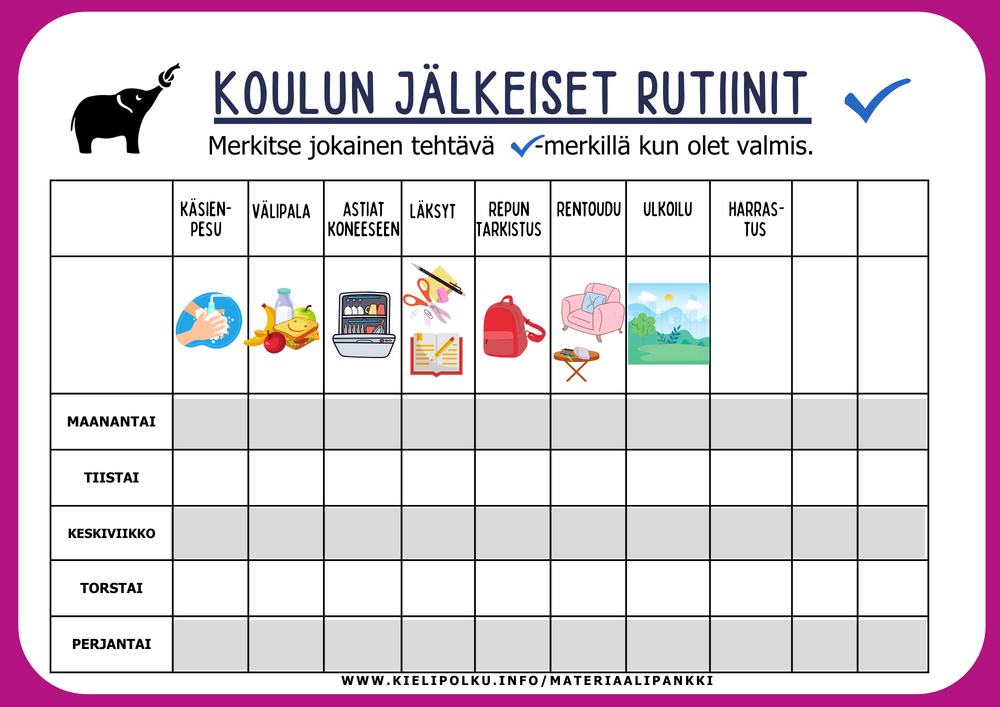 Aamurutiinit tuovat ennakoitavuutta, rauhaa ja rakennetta päivään. Kun rutiinit ovat listattuna ja kuvina, ne auttavat lasta hahmottamaan, mitä tapahtuu seuraavaksi. Lapsi voi seurata listaa itse ja rastittaa. Mukana on myös tyhjää tilaa, johon voit lisätä juuri sinun perheellesi tärkeitä aamutoimia.