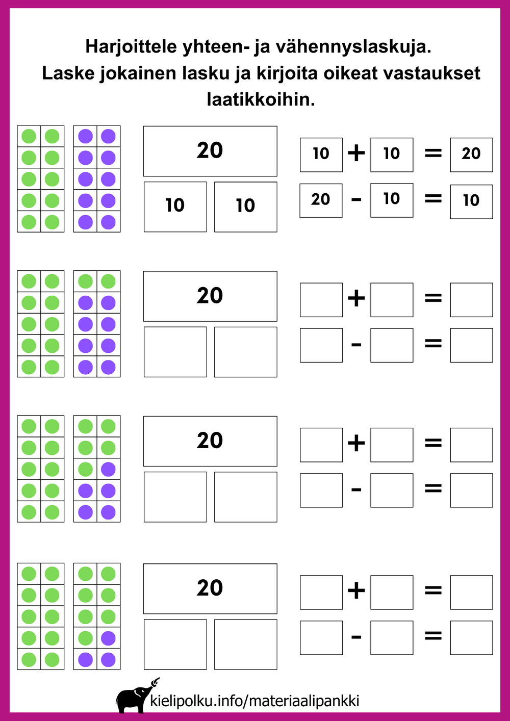 Harjoittele yhteen- ja vähennyslaskuja lukuun 20 asti.