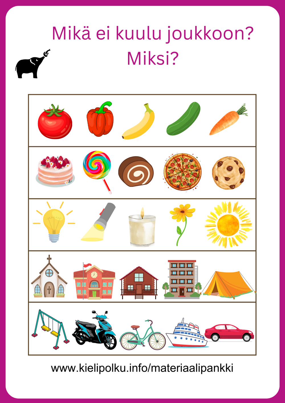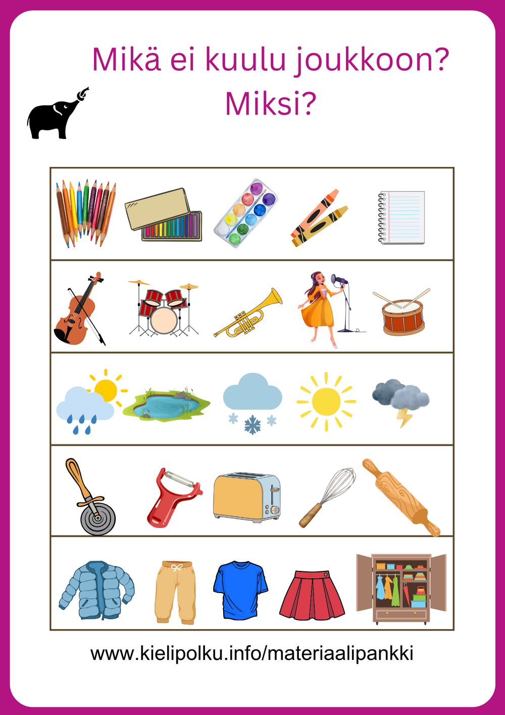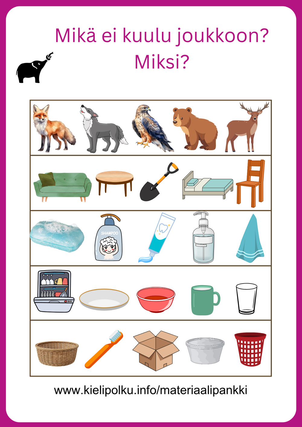 Tehtävä, jossa lapsen täytyy miettiä, mikä sana ei kuulu joukkoon, kehittää lasta monipuolisesti. Tämän tyyppiset tehtävät ovat erityisen hyödyllisiä kehityksellisen kielihäiriön kuntoutuksessa. Tehtävä vaatii keskittymistä yksityiskohtiin ja huomion kohdistamista olennaisiin eroihin. Lapsi harjoittelee luokittelemaan sanoja merkityksen, ominaisuuksien tai käyttötarkoituksen mukaan. Mikä yhdistää sanoja ja mikä erottaa. Tämä tukee kognitiivista jäsentelykykyä, joka on tärkeä oppimisessa. Tässä tehtävässä lapsen läheinen, puheterapeutti tai opettaja, miettii yhdessä lapsen kanssa, mitä sanoja riveillä on. Ne nimetään. Sitten annetaan lapsen pohtia mikä sana ei kuulu joukkoon ja perustella valintansa. Suhtautumisemme vaikuttaa suuresti siihen, miten lapsi suhtautuu oppimiseen ja itseensä. Jos kuulemme väärän vastauksen, voimme sanoa "Olipa hyvä että pohdit, katsotaanpa toista vaihtoehtoa". "Katsotaanpa ja mietitään yhdessä". "Miten ajattelit kun valitsit sen sanan". "Voisiko joku toinen sana sopia paremmin joukkoon?" Käytä huumoria. Yhdessä etsitään oikeaa vastausta ja selitetään vastaukset.