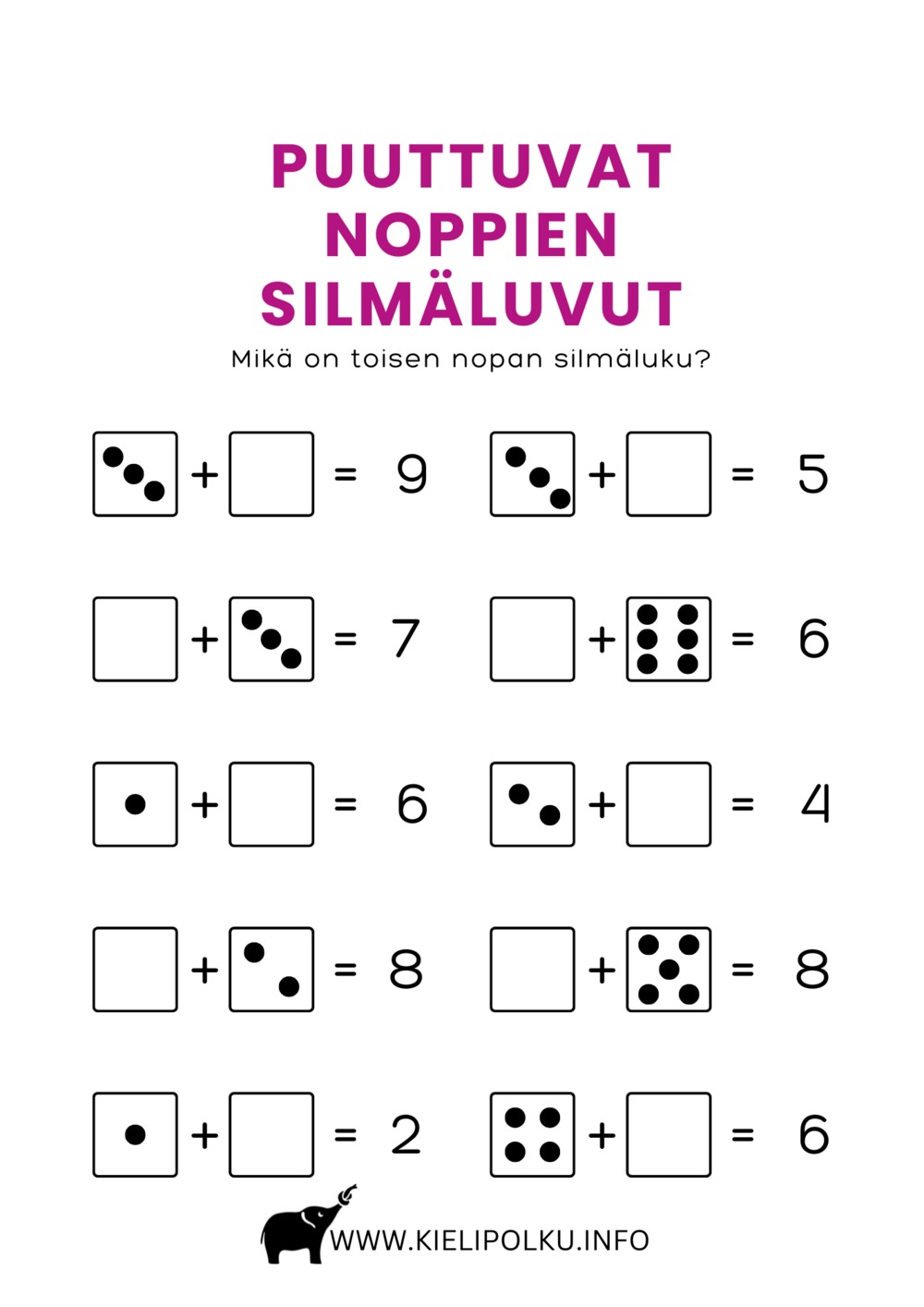 Tässä tehtävässä opitaan laskemaan, lisäämällä puuttuvan silmäluku noppaan.
