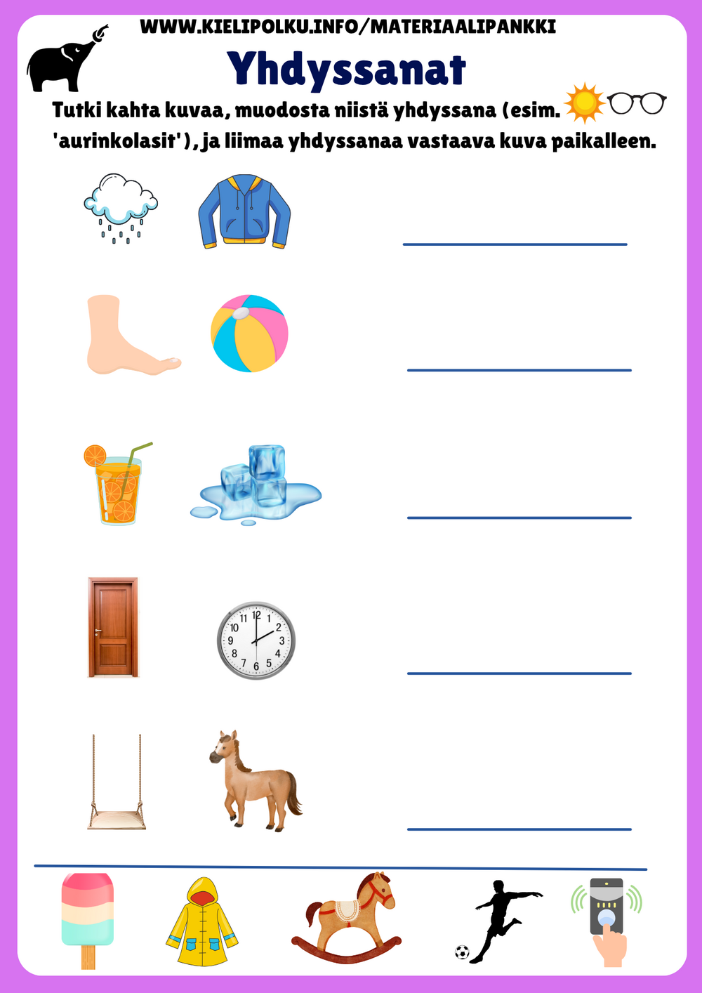 Harjoittelu yhdyssanojen kanssa voi olla erittäin hyödyllistä lapselle, joka käy puheterapiassa. Tässä muutamia keskeisiä hyötyjä. Yhdyssanat kehittävät lapsen ymmärrystä siitä, miten sanat rakentuvat ja miten merkitys muuttuu, kun sanoja yhdistetään. Tämä tukee fonologista tietoisuutta, joka on tärkeää puheen ja lukemisen kehityksessä. Yhdyssanojen muodostaminen vaatii lapselta loogista päättelyä: mitä kaksi sanaa yhdessä tarkoittavat ja miten ne liittyvät toisiinsa. Tämä tukee myös yleistä kognitiivista kehitystä. Kun samalla lapsi pääsee leikkaamaan ja liimaamaan kuvia, harjoittelu vahvistaa käden lihaksia ja koordinaatiota, mikä tukee esimerkiksi kynän käyttöä ja kirjoittamista.