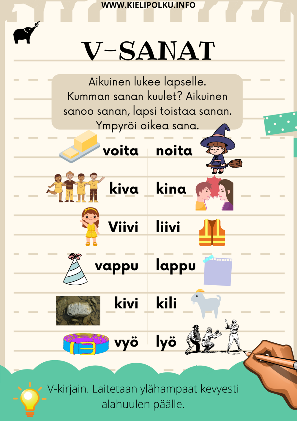 V-kirjaimen äänne harjoitus, tarkoitettu aikuisen tehtäväksi lapsen kanssa