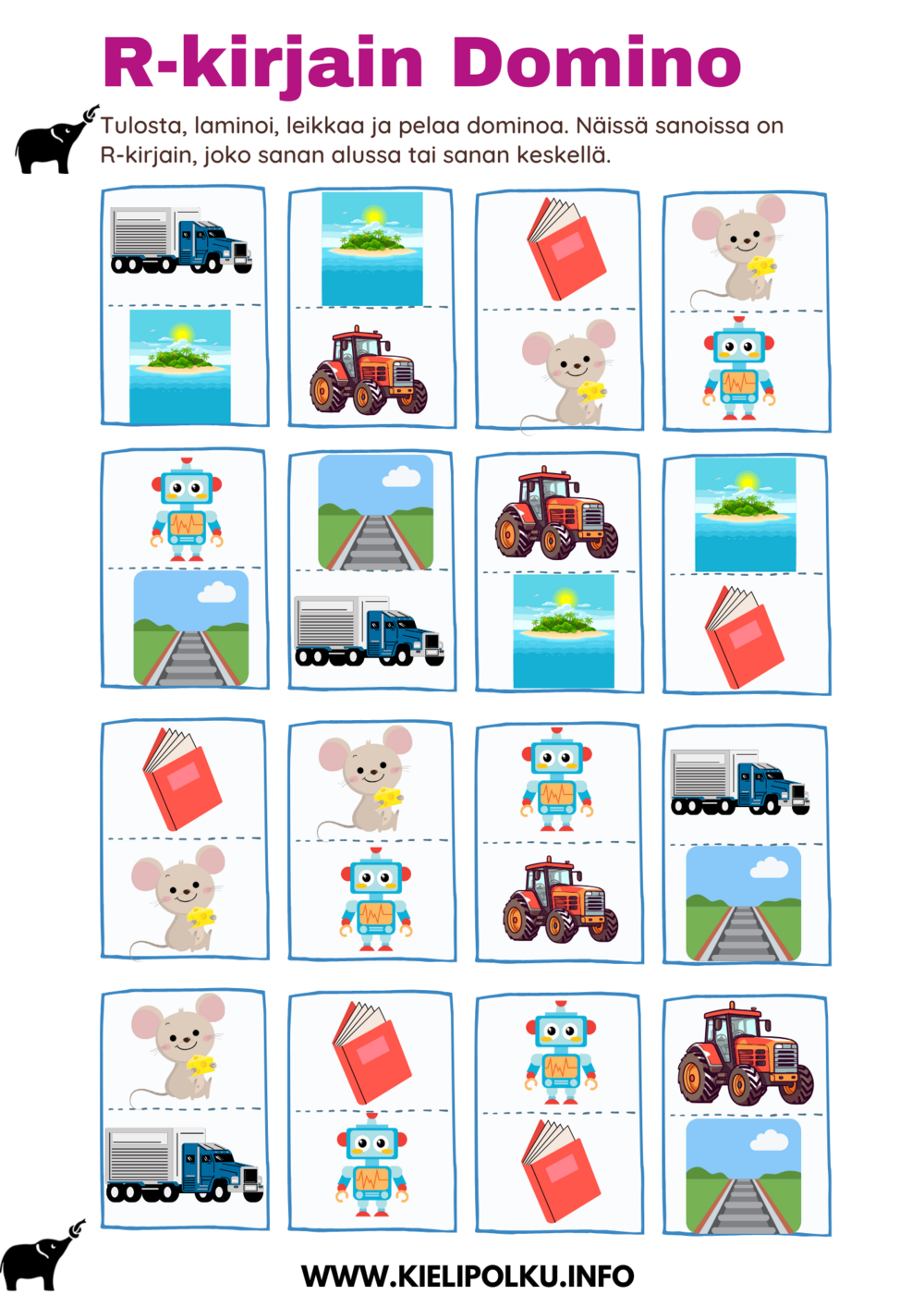 Harjoittele lapsen kanssa, aikuinen sanoo sanan, lapsi kuuntelee. ja mietitään missä sanoissa löytyy R-äänne.