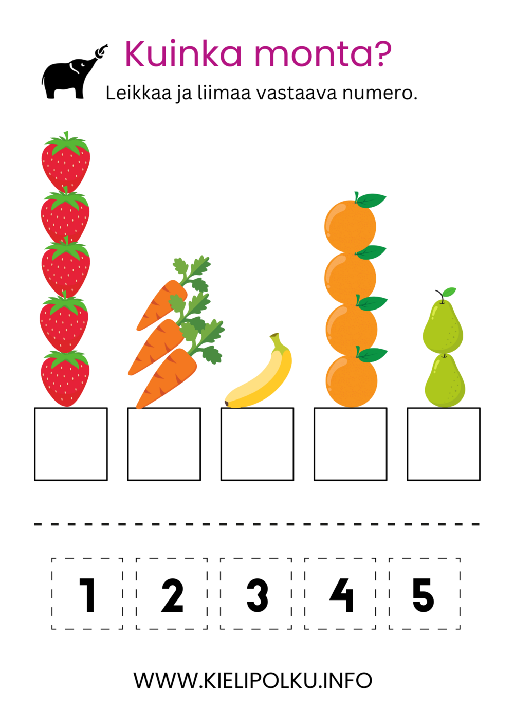 Harjoittele numeroja 1-5. Samalla voi harjoitella värejä, saksien käyttöä ja liimaamista.
