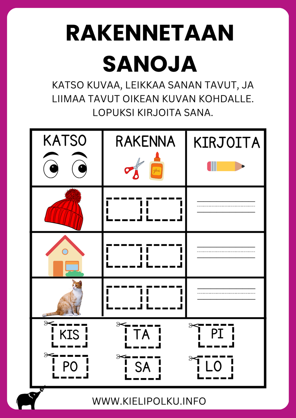 Tässä tehtävässä mietitään mikä sana on kyseessä. Leikatataan sanojen tavut, ja sitten liimataan ne muodostamaan tavuja, ja kirjoitetaan uusi sana.