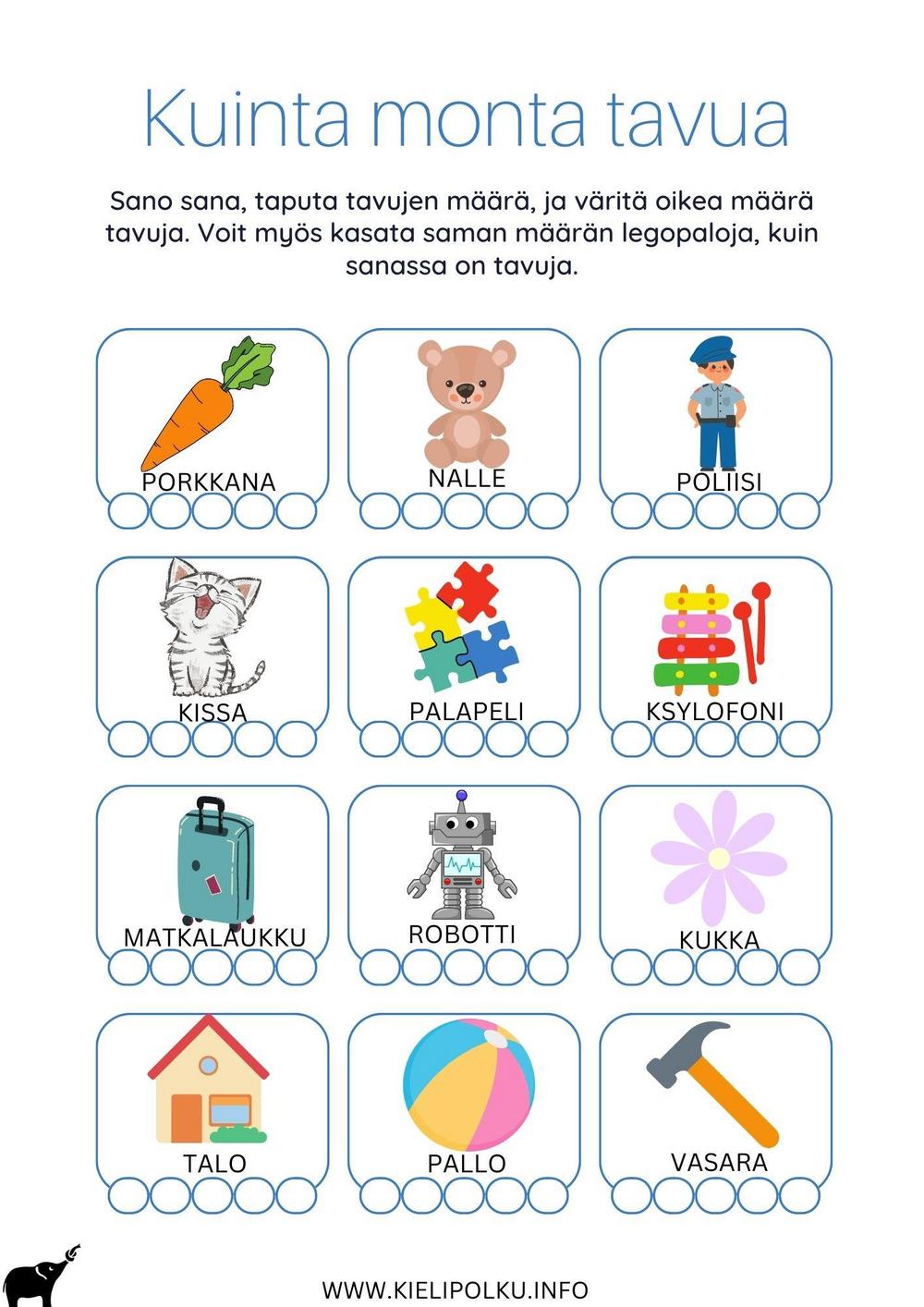 Kuuntele, sano sana, taputa tavujen määrä, kuinka monta tavua, sitten väritä tavujen määrä, tai kasaa sama määrä legoja sanojen päälle kuin tavuja on.