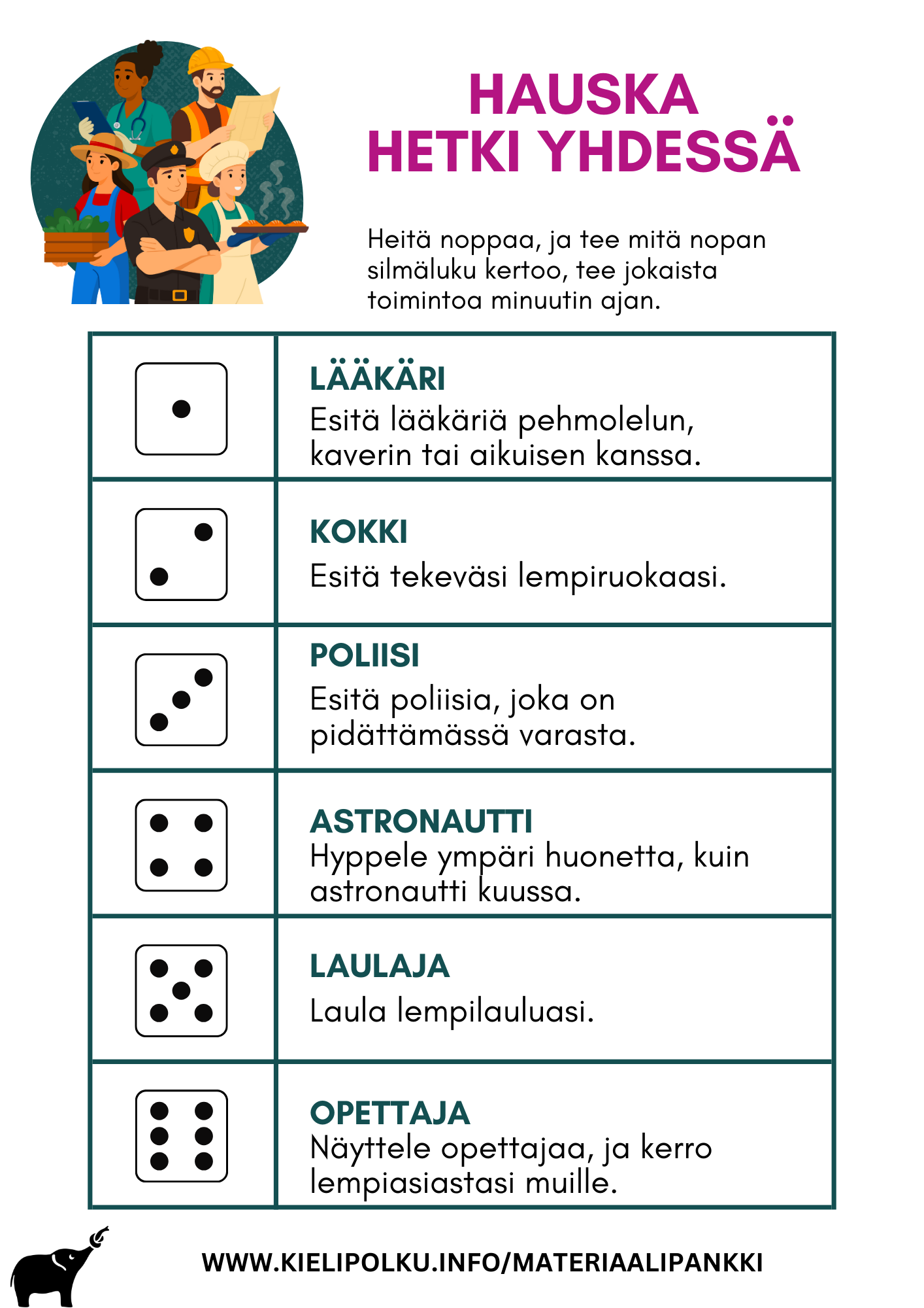 Tulosta, leikkaa viivoja pitkin, liimaa. Heitä sitten noppaa ja kerro tarina. Tarina vaihtelee jokaisella kerralla.