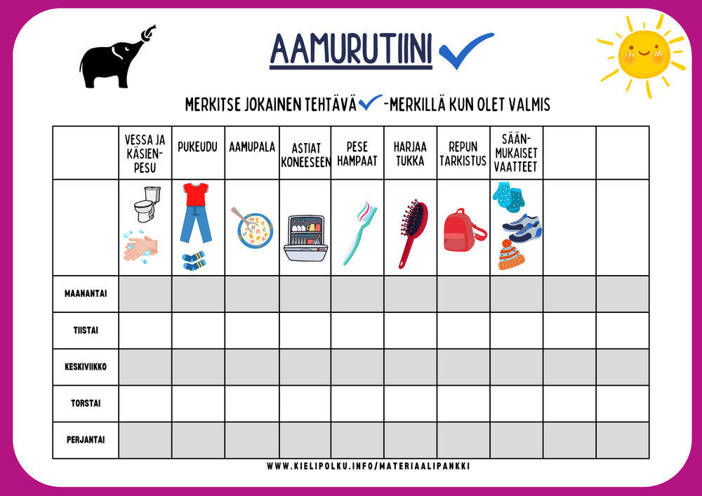 Aamurutiinit tuovat ennakoitavuutta, rauhaa ja rakennetta päivään. Kun rutiinit ovat listattuna ja kuvina, ne auttavat lasta hahmottamaan, mitä tapahtuu seuraavaksi. Lapsi voi seurata listaa itse ja rastittaa. Mukana on myös tyhjää tilaa, johon voit lisätä juuri sinun perheellesi tärkeitä aamutoimia.