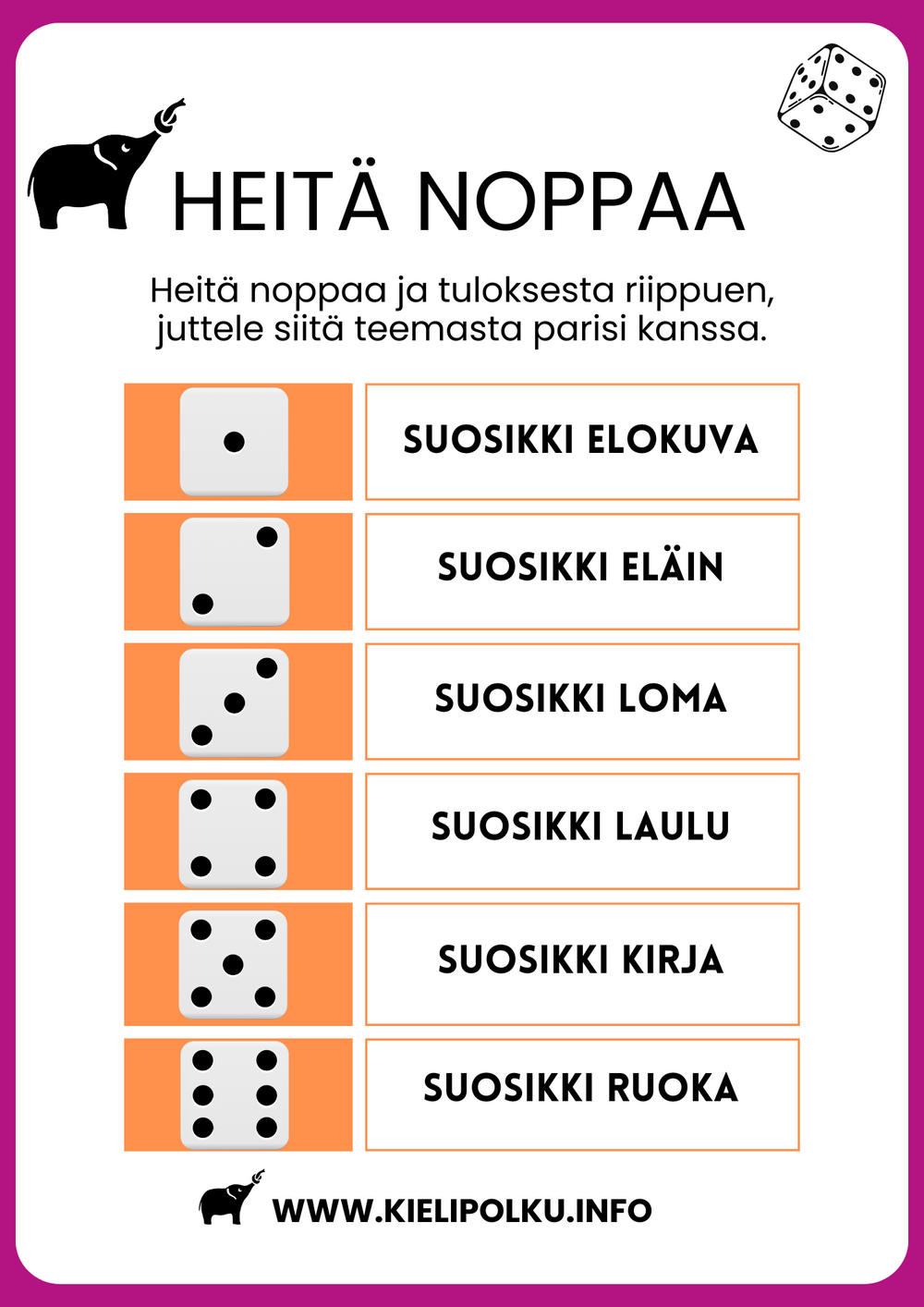 Suomen Kielipolku SLI ry:n materiaalien käyttöehtona on dokumentin tulostaminen alkuperäisenä, jotta yhdistyksen tiedot näkyvät tulosteessa. Materiaalia ei saa myöskään käyttää mihinkään kaupalliseen tarkoitukseen. Jos käytät dokumentteja jossakin, muista mainita lähde.