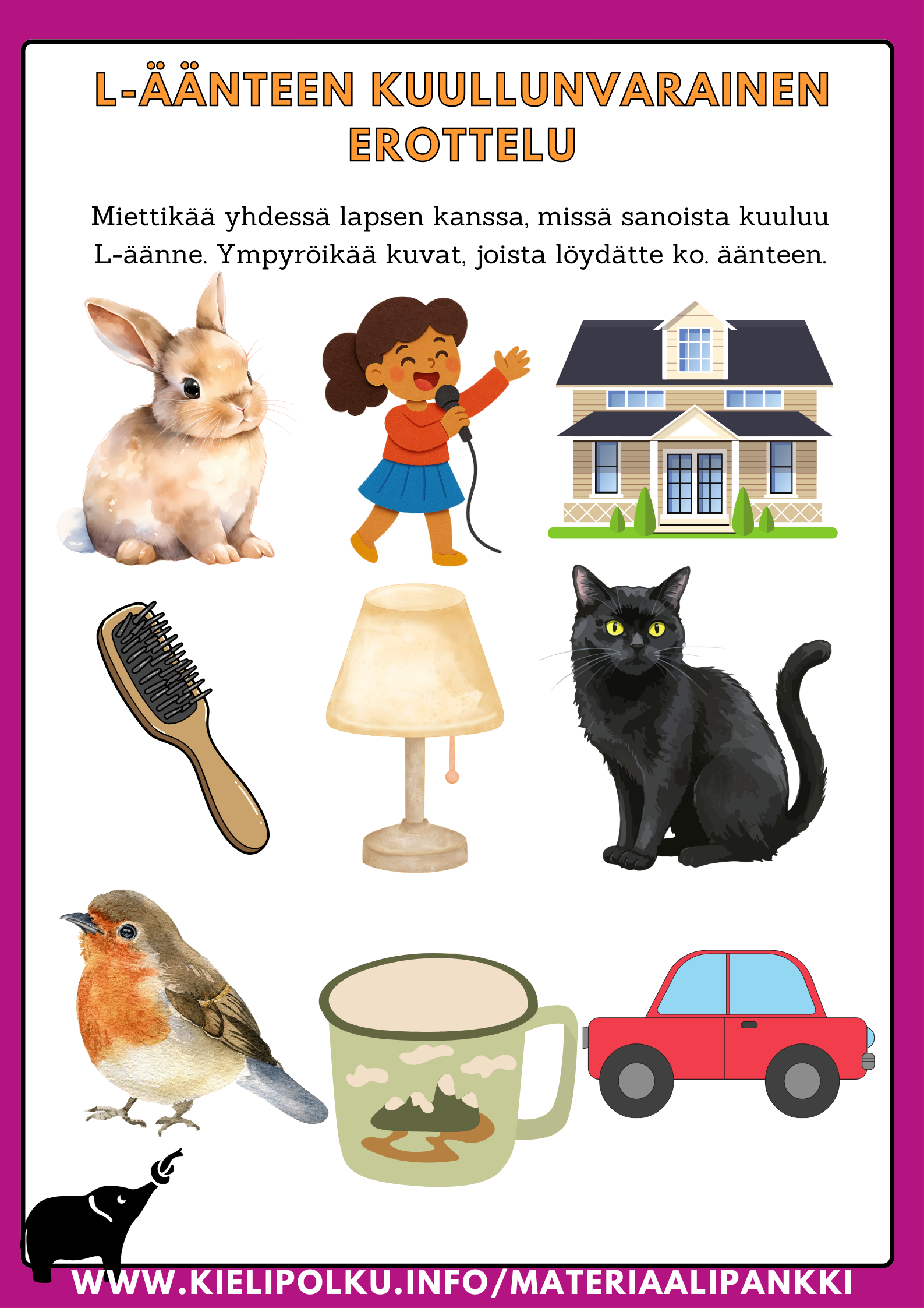 Tässä harjoituksessa aikuinen lukee lapselle sanat, lapsi kuuntelee ja ympyröi sanan, joka kuulostaa erilaiselta. Samalla voi harjoitella sanomaan sanoja. Aikuinen voi myös kuvailla joka sanan, ja lapsi arvaa mistä sanasta on kyse, joko näyttämällä sanan, tai sanomalla sen nimen. Sanoja voi myös tarkastella niin, että mietitään lapsen kanssa, mikä sanoissa on erilaista. Esim. Puu, Suu, Kuu.