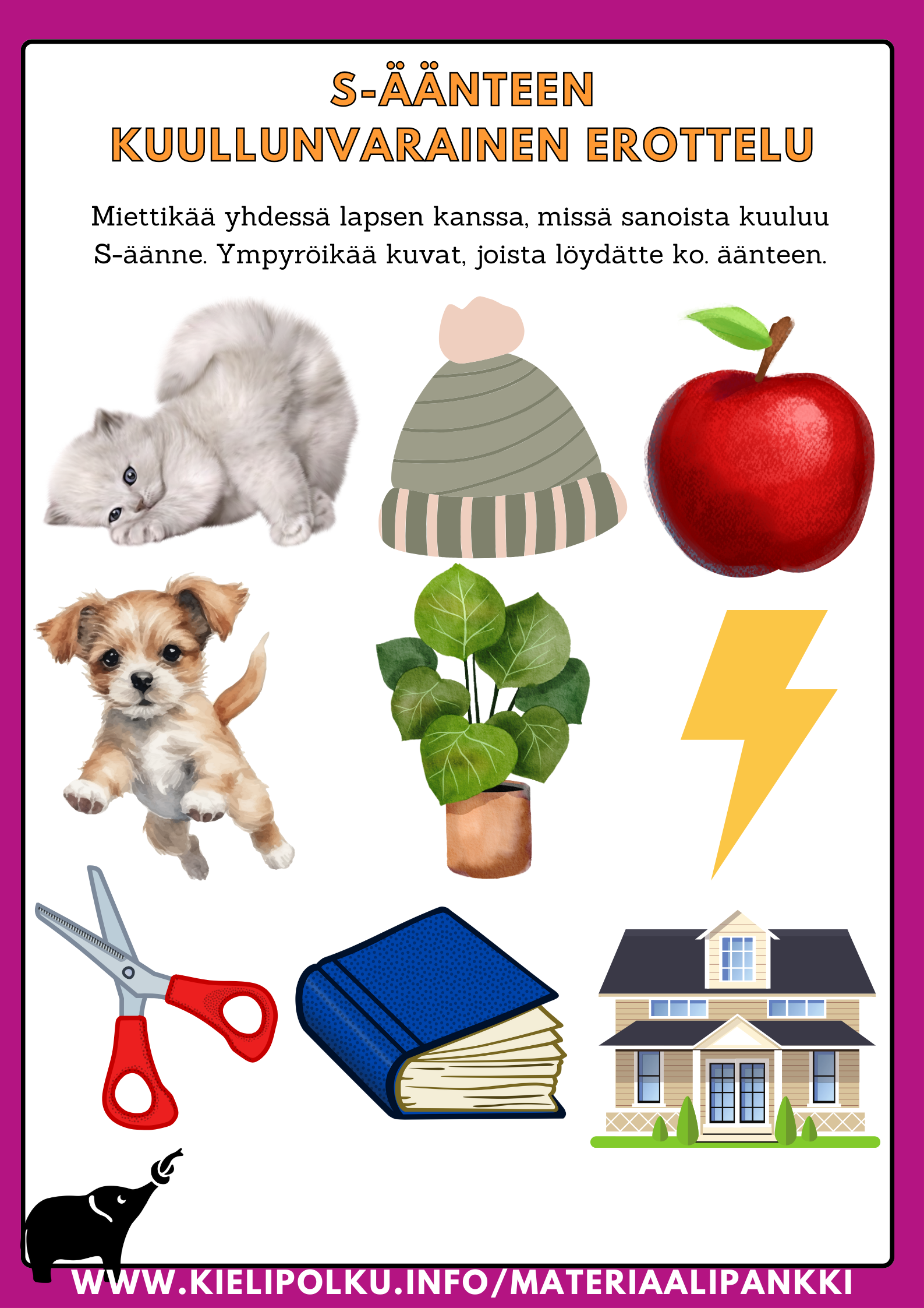 Tämän tehtävän kautta voi harjoitella lapsen kanssa sanojen alkuäänteitä. Tutkitaan kirjainten äänteitä ja mietitään, mikä äänne sanojen alussa kuuluu. Aikuinen sanoo sanan, lapsi kuuntelee, ja ympyröi oikean vastauksen. Kun taidot vahvistuvat, voi miettiä sanojen loppua myös.