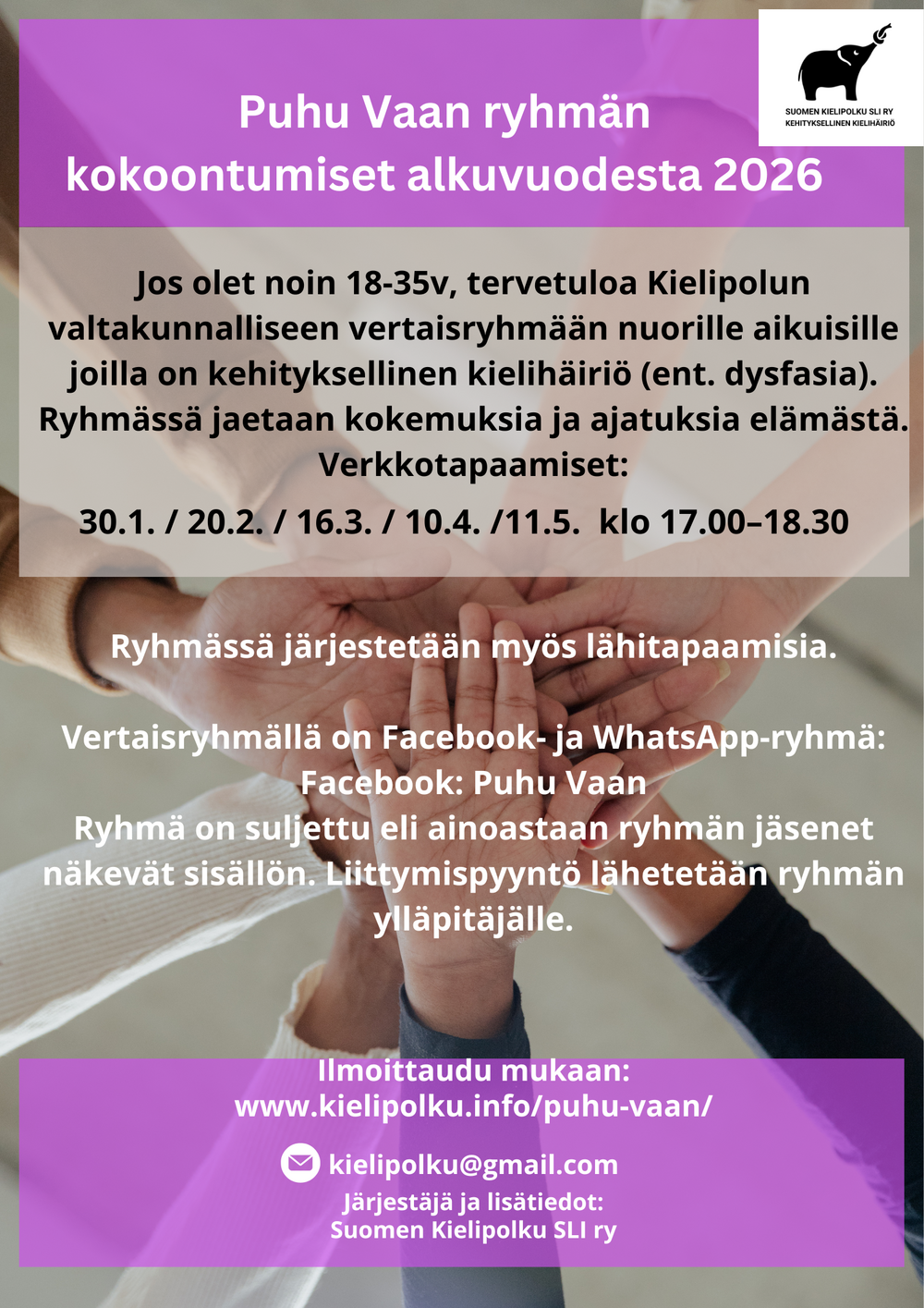 Suomen Kielipolku SLI ry:n valtakunnallinen vertaisryhmä nuorille aikuisille (18-35v.), joilla on kehityksellinen kielihäiriö (ent. dysfasia ja kielellinen erityisvaikeus). Ryhmässä on tarkoitus jakaa kokemuksia ja ajatuksia elämästä, johon kehityksellinen kielihäiriö vaikuttaa hiukan tai paljon.