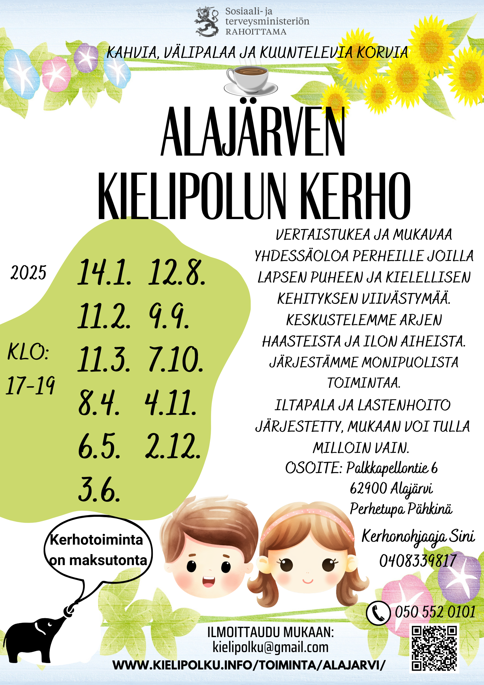 Kerhotoiminta on maksutonta perheille. Mukaan voi tulla koko perhe, tai vaikkapa toinen vanhemmista, ja isovanhempikin voi halutessaan tulla kerhoon mukaan. Mukavaa keskustelua hyvässä, luottamuksellisessa ilmapiirissä kehityksellisestä kielihäiriöstä, siihen liittyvistä asioista, arjen iloista ja haasteita.