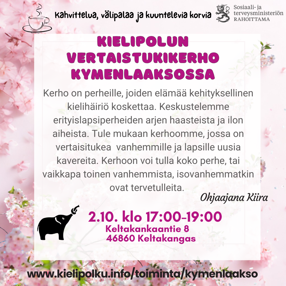 Kerhotoiminta on maksutonta perheille. Mukaan voi tulla koko perhe, tai vaikkapa toinen vanhemmista, ja isovanhempikin voi halutessaan tulla kerhoon mukaan. Mukavaa keskustelua hyvässä, luottamuksellisessa ilmapiirissä kehityksellisestä kielihäiriöstä, siihen liittyvistä asioista, arjen iloista ja haasteita.