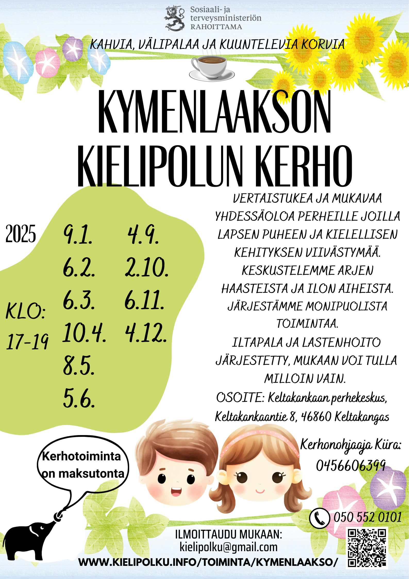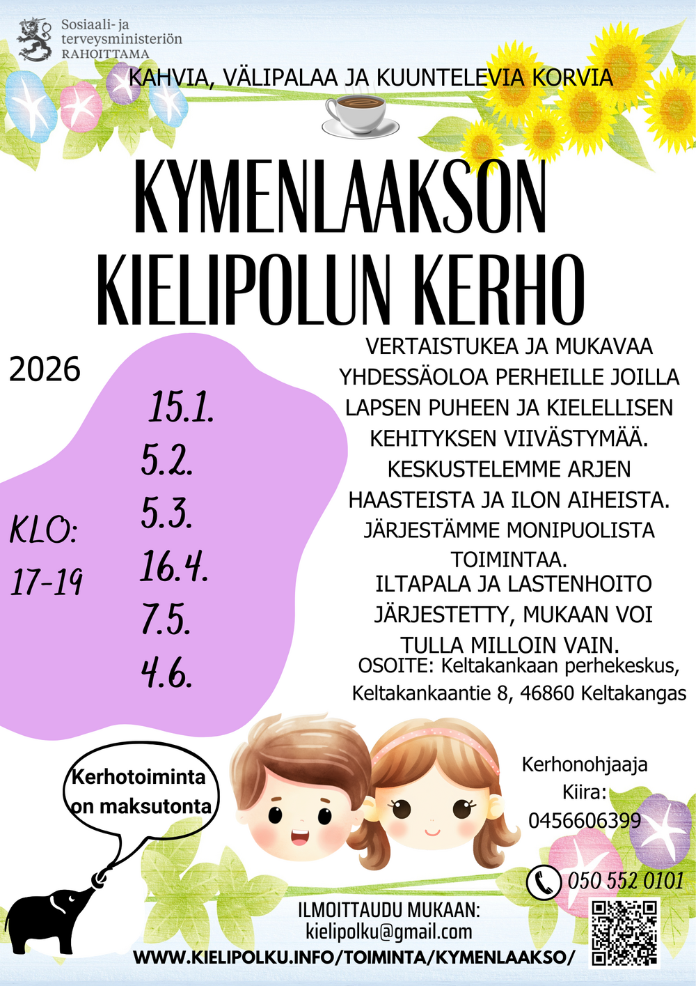 Kerhotoiminta on maksutonta perheille. Mukaan voi tulla koko perhe, tai vaikkapa toinen vanhemmista, ja isovanhempikin voi halutessaan tulla kerhoon mukaan. Mukavaa keskustelua hyvässä, luottamuksellisessa ilmapiirissä kehityksellisestä kielihäiriöstä, siihen liittyvistä asioista, arjen iloista ja haasteita.
