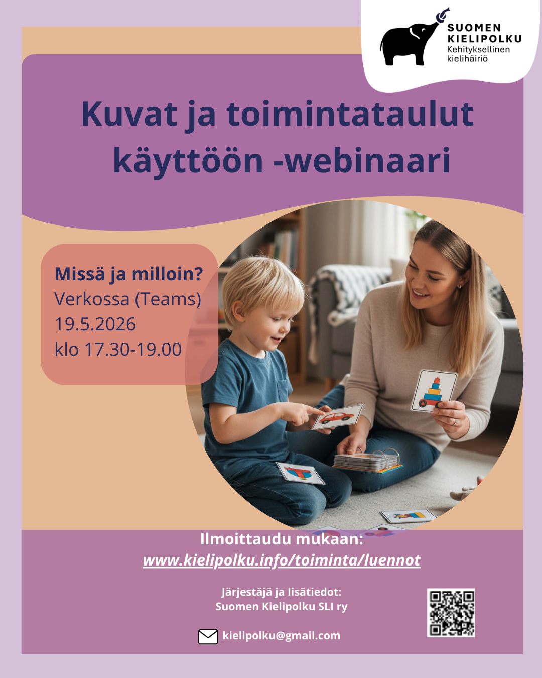 Tervetuloa webinaariin, jossa perehdytään kuvien ja toimintataulujen käyttöön lapsen kielen kehityksen ja kommunikoinnin tukena arjen tilanteissa. Tilaisuudessa saat keinoja ja vinkkejä kuvien käyttöön ja materiaalia arjen tueksi.