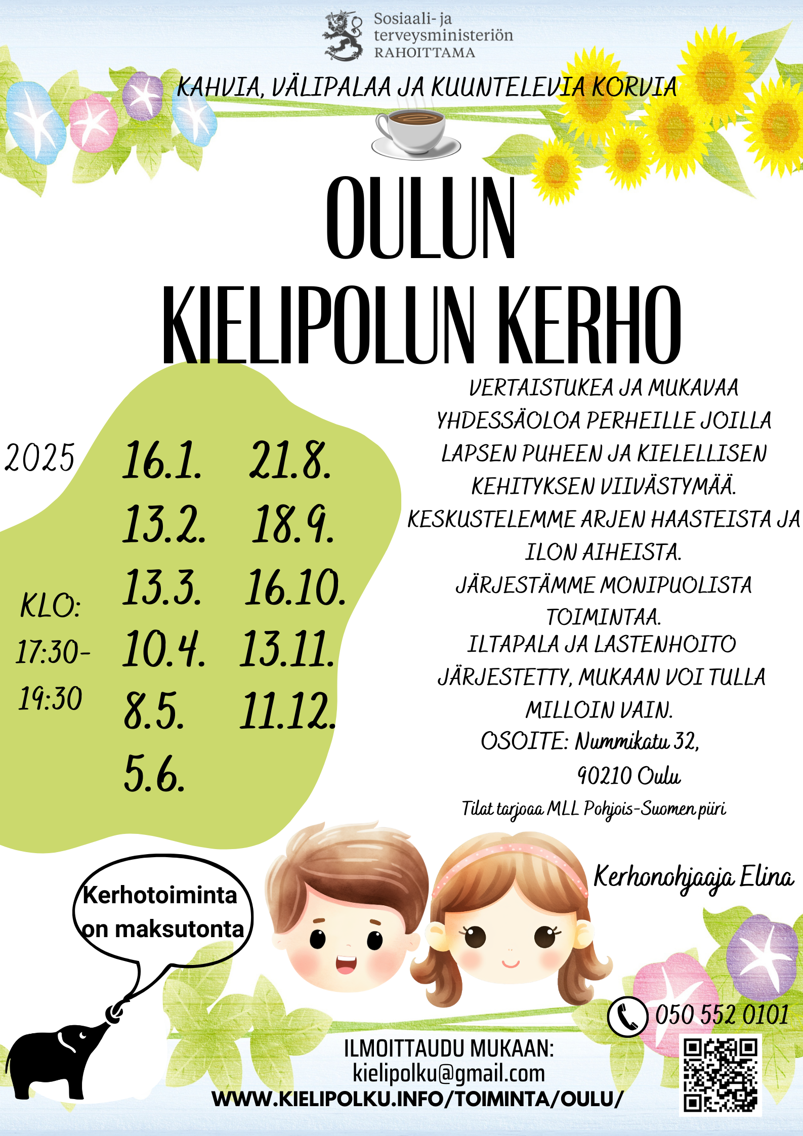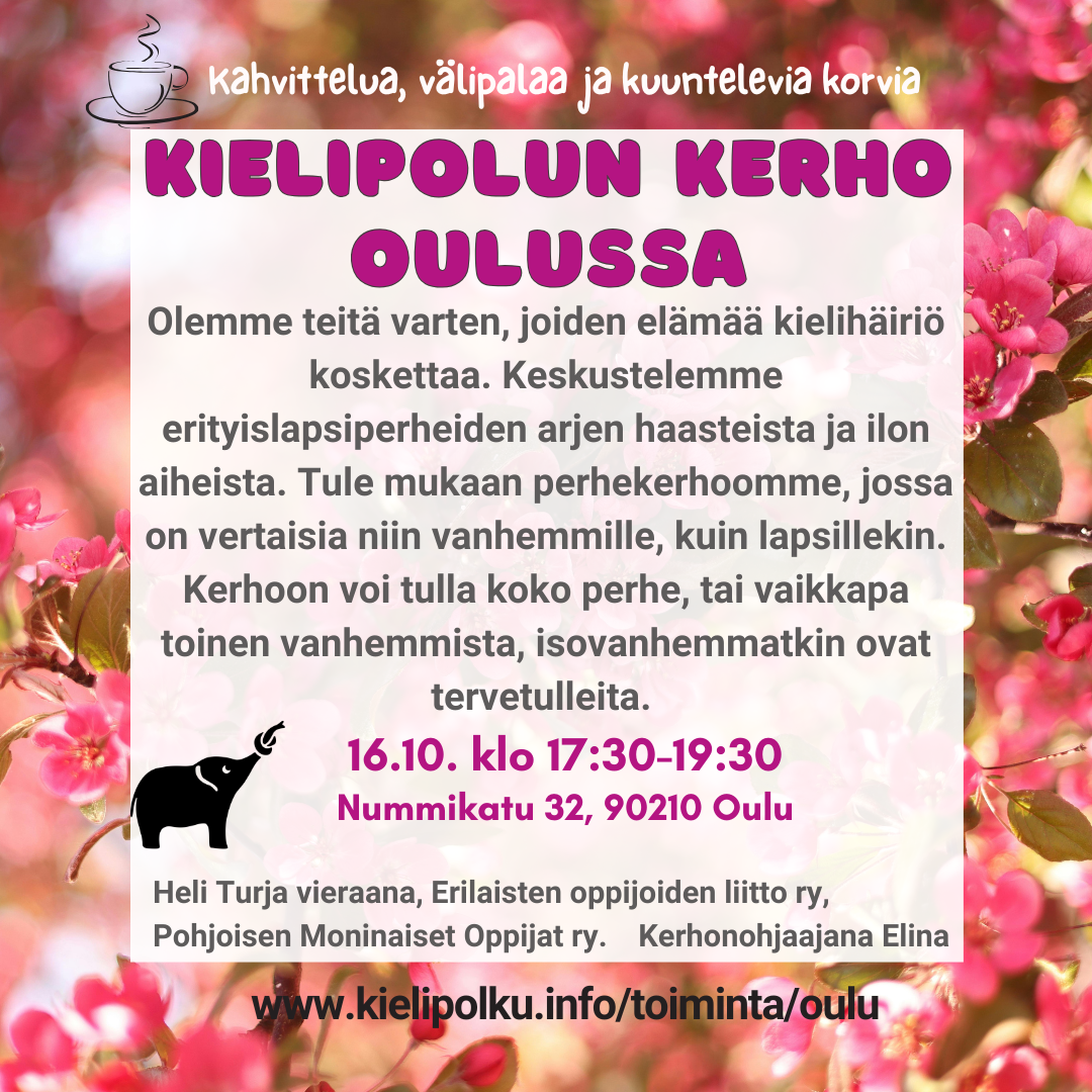 Kielipolun perhekerhossa voit istahtaa hetkeksi alas, juoda kupin kahvia ja jutella samassa elämäntilanteessa olevien muiden vanhempien kanssa, lasten leikkiessä hoitajan kanssa. Mukavaa keskustelua hyvässä, luottamuksellisessa ilmapiirissä kehityksellisestä kielihäiriöstä, siihen liittyvistä asioista, arjen iloista ja haasteita.