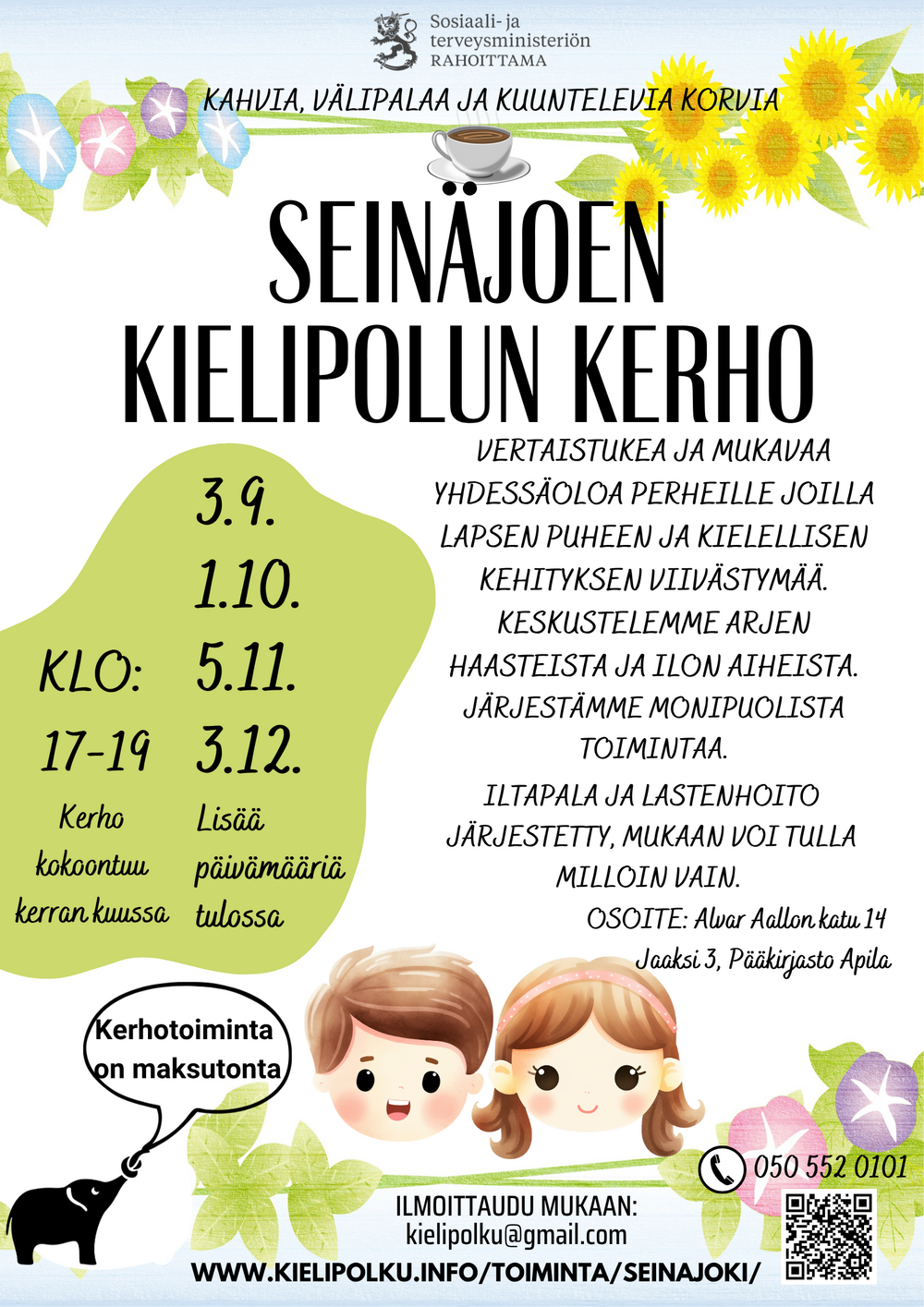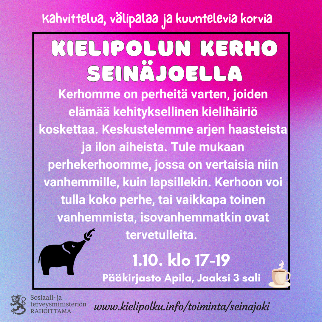 Kielipolun perhekerhossa voit istahtaa hetkeksi alas, juoda kupin kahvia ja jutella samassa elämäntilanteessa olevien muiden vanhempien kanssa, lasten leikkiessä hoitajien kanssa. Tervetuloa mukaan kaikki uudet ja vanhat! Myös isovanhemmat ja lapsen muut läheiset ovat tervetulleita mukaan toimintaan.