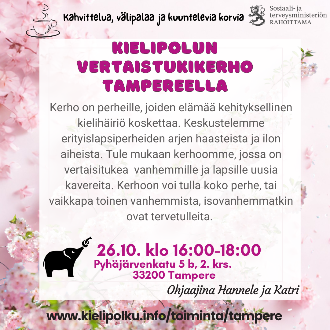 Kielipolun perhekerhossa voit istahtaa hetkeksi alas, juoda kupin kahvia ja jutella samassa elämäntilanteessa olevien muiden vanhempien kanssa, lasten leikkiessä hoitajien kanssa. Mukavaa keskustelua hyvässä, luottamuksellisessa ilmapiirissä kehityksellisestä kielihäiriöstä, siihen liittyvistä asioista, arjen iloista ja haasteita.