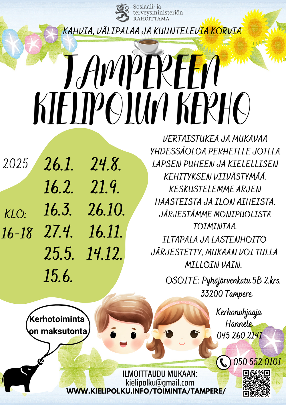Kielipolun perhekerhossa voit istahtaa hetkeksi alas, juoda kupin kahvia ja jutella samassa elämäntilanteessa olevien muiden vanhempien kanssa, lasten leikkiessä hoitajien kanssa. Mukavaa keskustelua hyvässä, luottamuksellisessa ilmapiirissä kehityksellisestä kielihäiriöstä, siihen liittyvistä asioista, arjen iloista ja haasteita.