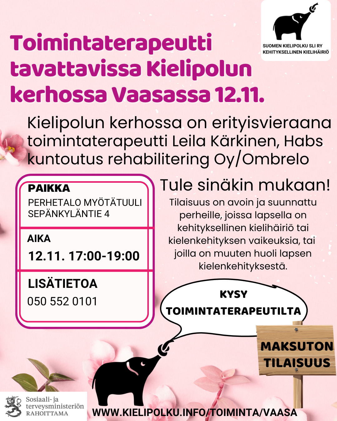 Istahda alas, juo kuppi kahvia ja juttele samassa elämäntilanteessa olevien muiden vanhempien kanssa. Lapset saavat touhuta toistensa kanssa lastenhoitajien valvoessa. Kerhoon ovat tervetulleita kaikki, joita huolettaa lapsen kielenkehitys, lapsella on kehityksellinen kielihäiriö tai nepsy-pulmia.