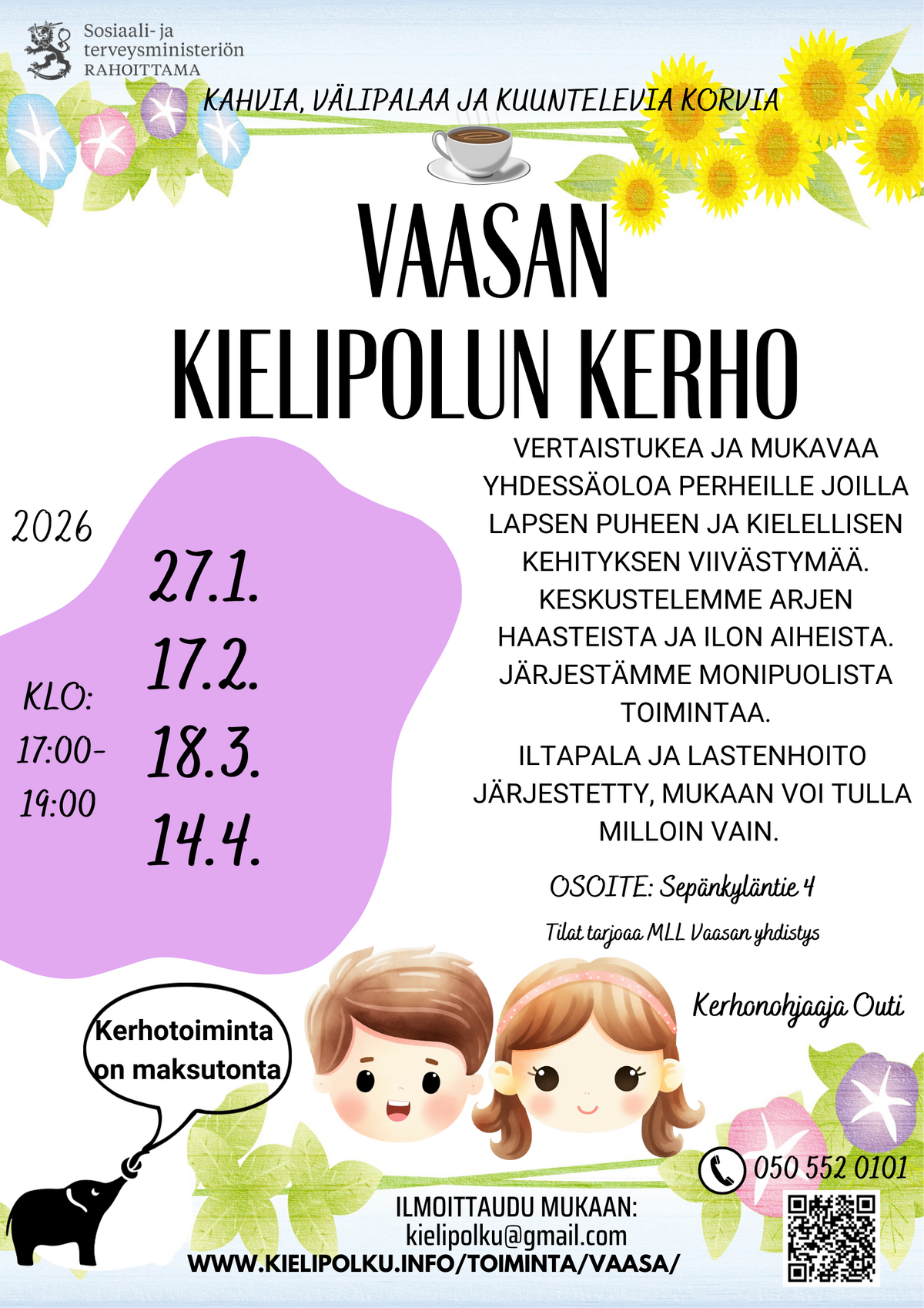 Istahda alas, juo kuppi kahvia ja juttele samassa elämäntilanteessa olevien muiden vanhempien kanssa. Lapset saavat touhuta toistensa kanssa lastenhoitajien valvoessa. Kerhoon ovat tervetulleita kaikki, joita huolettaa lapsen kielenkehitys, lapsella on kehityksellinen kielihäiriö tai nepsy-pulmia.